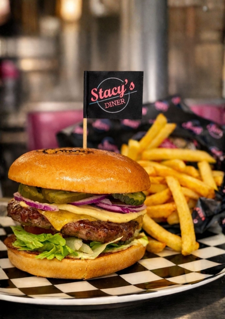 Stacy’s burger med en saftig hakkebøf, smeltet cheddarost, syltede agurker, kryddermayo, pebermayo, frisk tomat, sprød salat og rødløg + fritter til kun 99,-