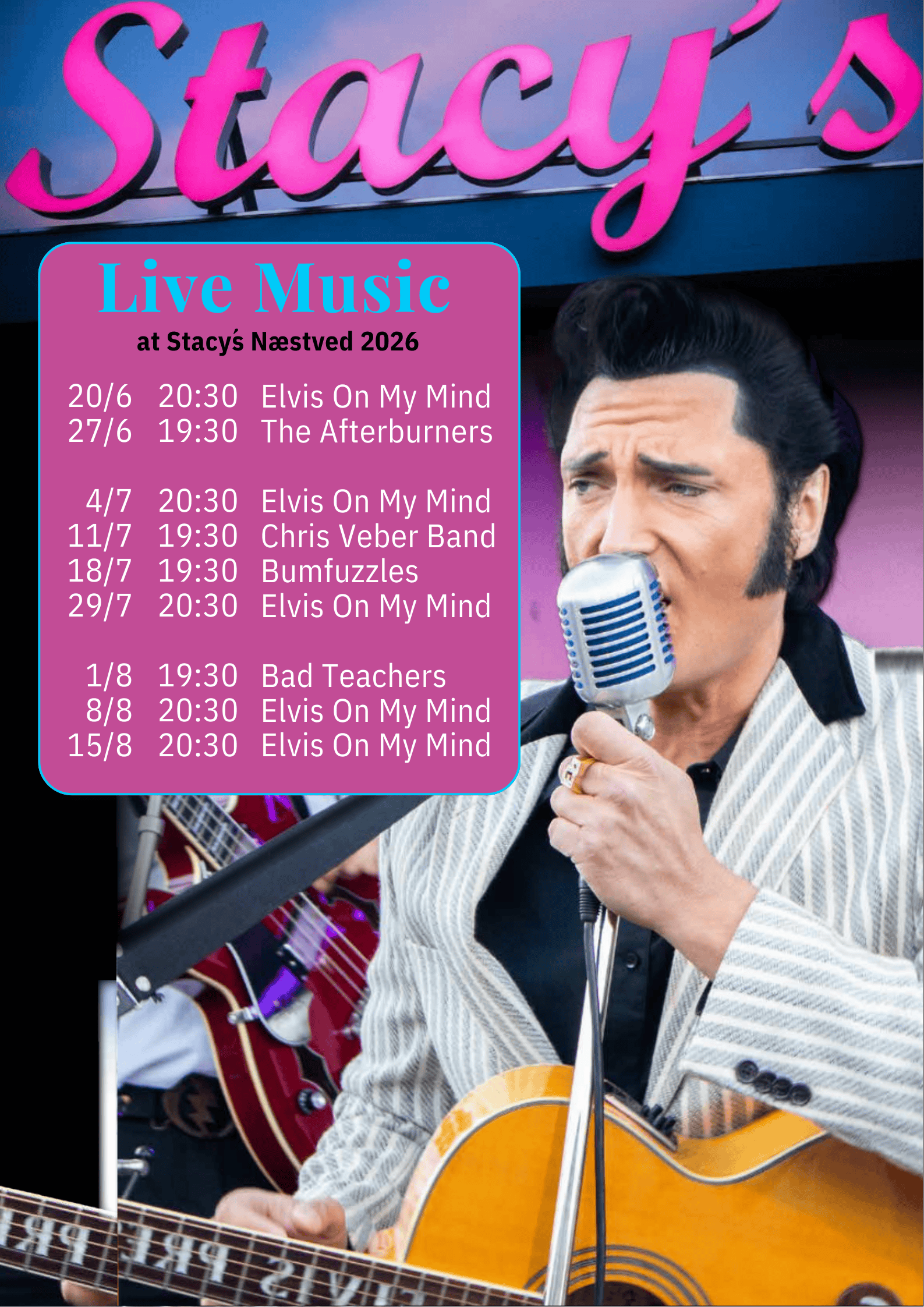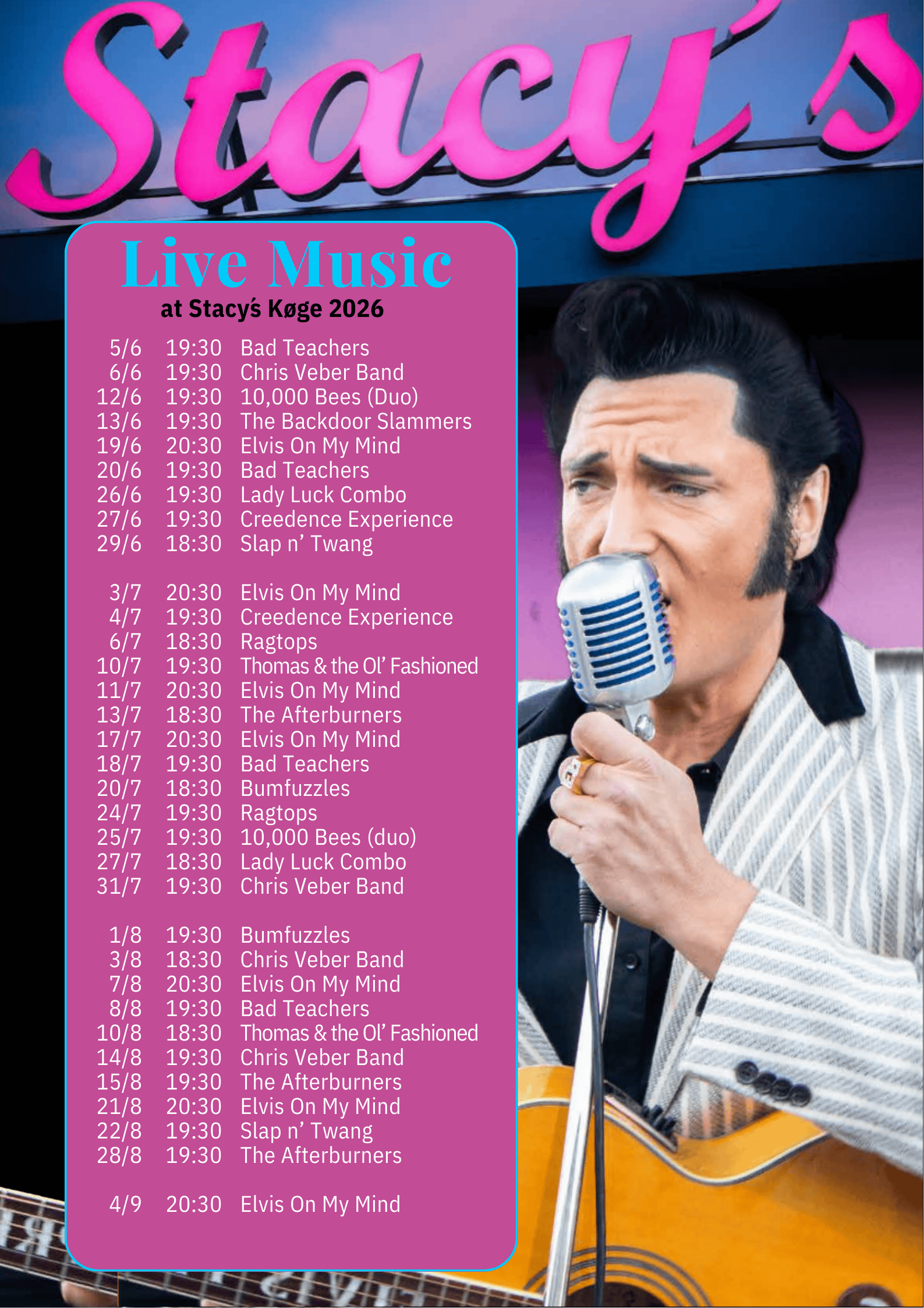 Det er med risiko for trippende fødder og voldsom trang til at smide alle hæmninger, når Stacy’s diner byder op til musik og dans fra dengang hvor Daells Varehus åbnede og der blot var 16.000 tv apparater fordelt i de danske hjem. Musikmæssigt hittede Elvis Presley listerne med bla All Shook Up og Jailhouse Rock, men også Bill Haley, Glenn Miller, Tommy Steel, og ikke mindst The Everly Brothers der med deres skønne klassiker om den søvnige frøken Susie, var med til at få de unge ud på dansegulvet.